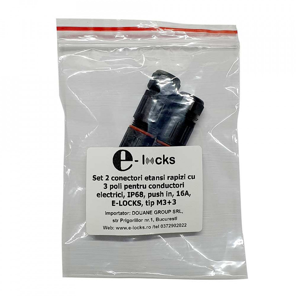 Set 2 conectori etansi rapizi cu 3 poli pentru conductori electrici, IP68, push in, 16A, E-LOCKS, tip M3+3