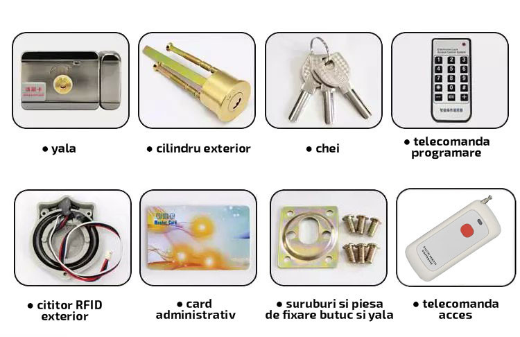 Continut pachet: yala electrica cu cititor RFID aplicat, telecomanda acces, telecomanda de programare, cilindru exterior, cititor RFID exterior, 3 chei, card management, suruburi de prindere.